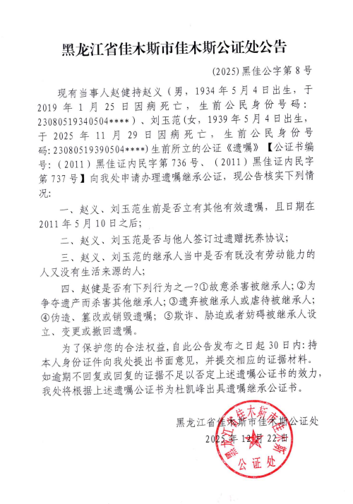 黑龙江省佳木斯市佳木斯公证处公告-(2025)黑佳公字第8号