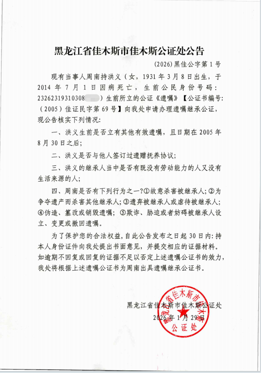 黑龙江省佳木斯市佳木斯公证处公告-(2026)黑佳公字第1号